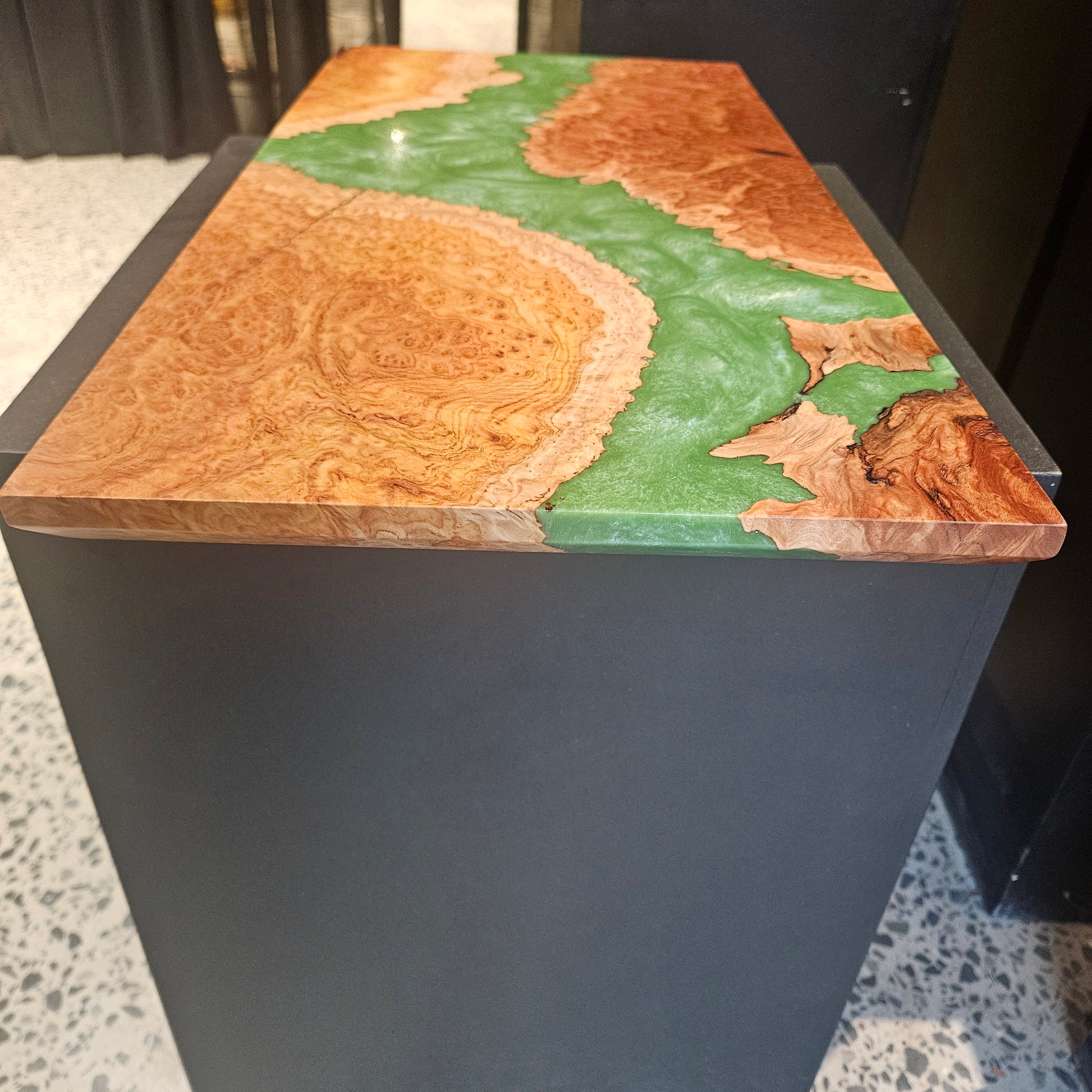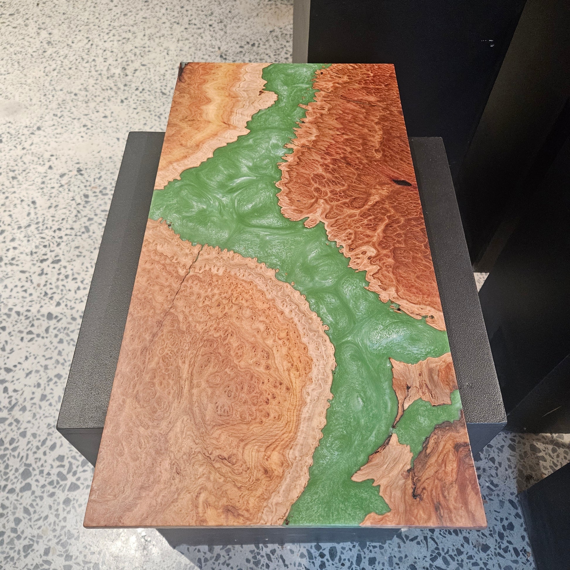 Beautiful Australian Marlee burl wood and pearlescent Jade green and White Pearl resin Chacuterie Board. Hand crafted one of a kind with a bevel detail around the edge. A beautiful way to present your cheese and fruit nibblies. The Chacuterie board is designed to present your grazing nibblies in a stunning appetising way for your guests. The surface is finished with a food grade oil/wax.