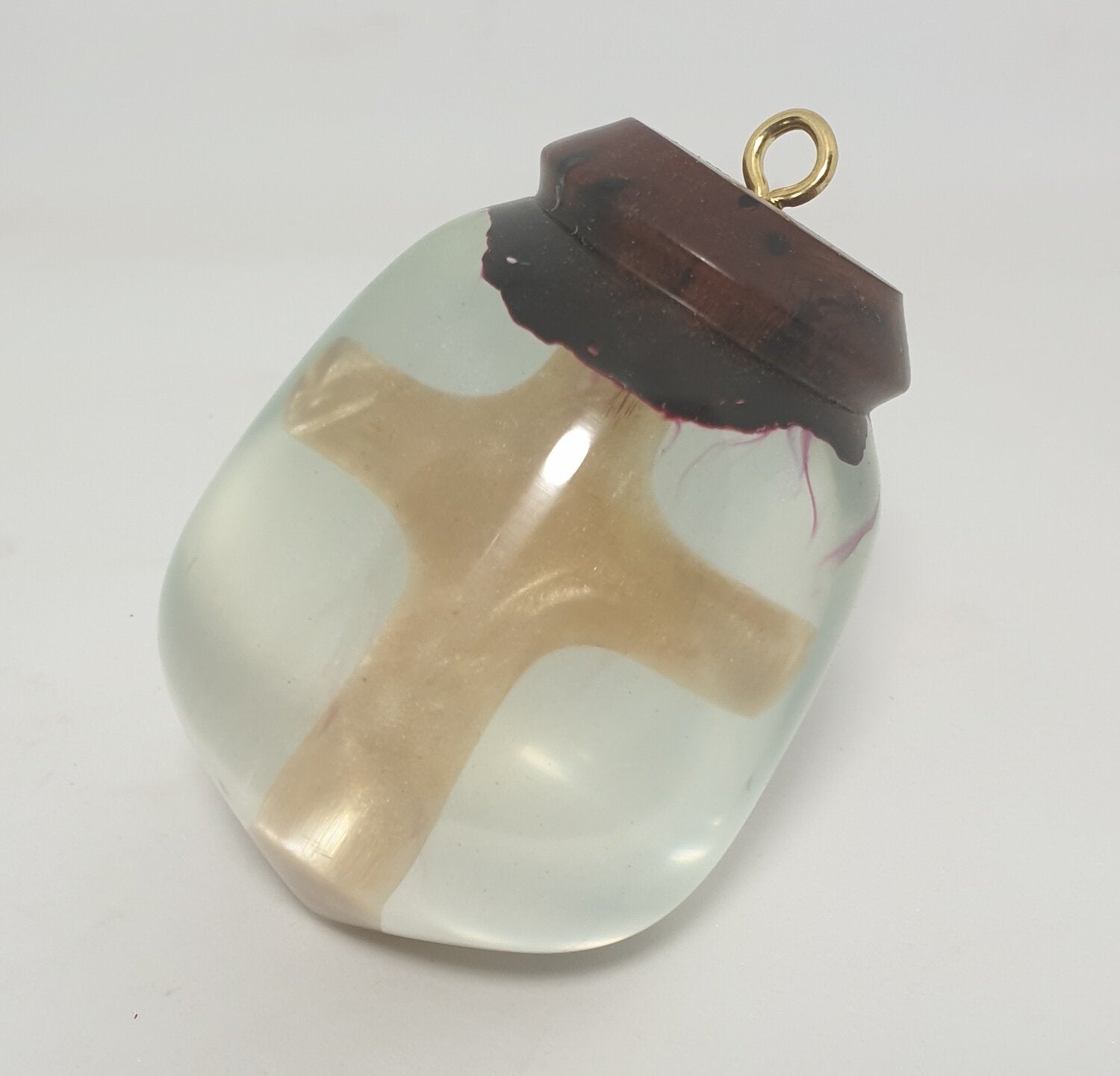 Handcrafted clear resin ornament with iron wood and embedded hand shaped yellow pearlescent cross. Coloured rope included with ornament.