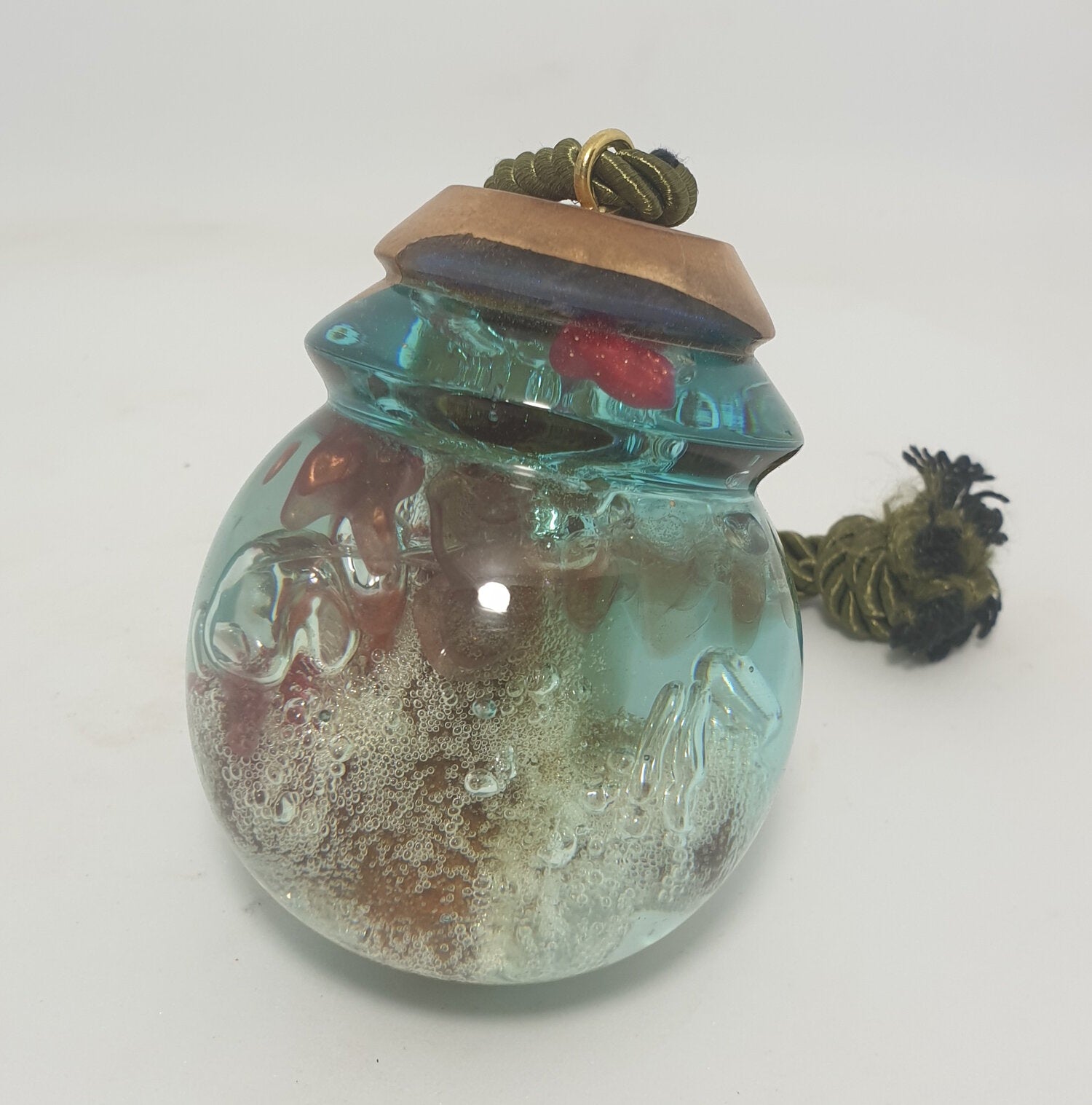 Clear resin ornament with iron wood and embedded hand shaped cross inside. The bubbles gives it an underwater feel. It also reflects nicely from the lights on your Christmas tree. Coloured rope is included on each ornament.