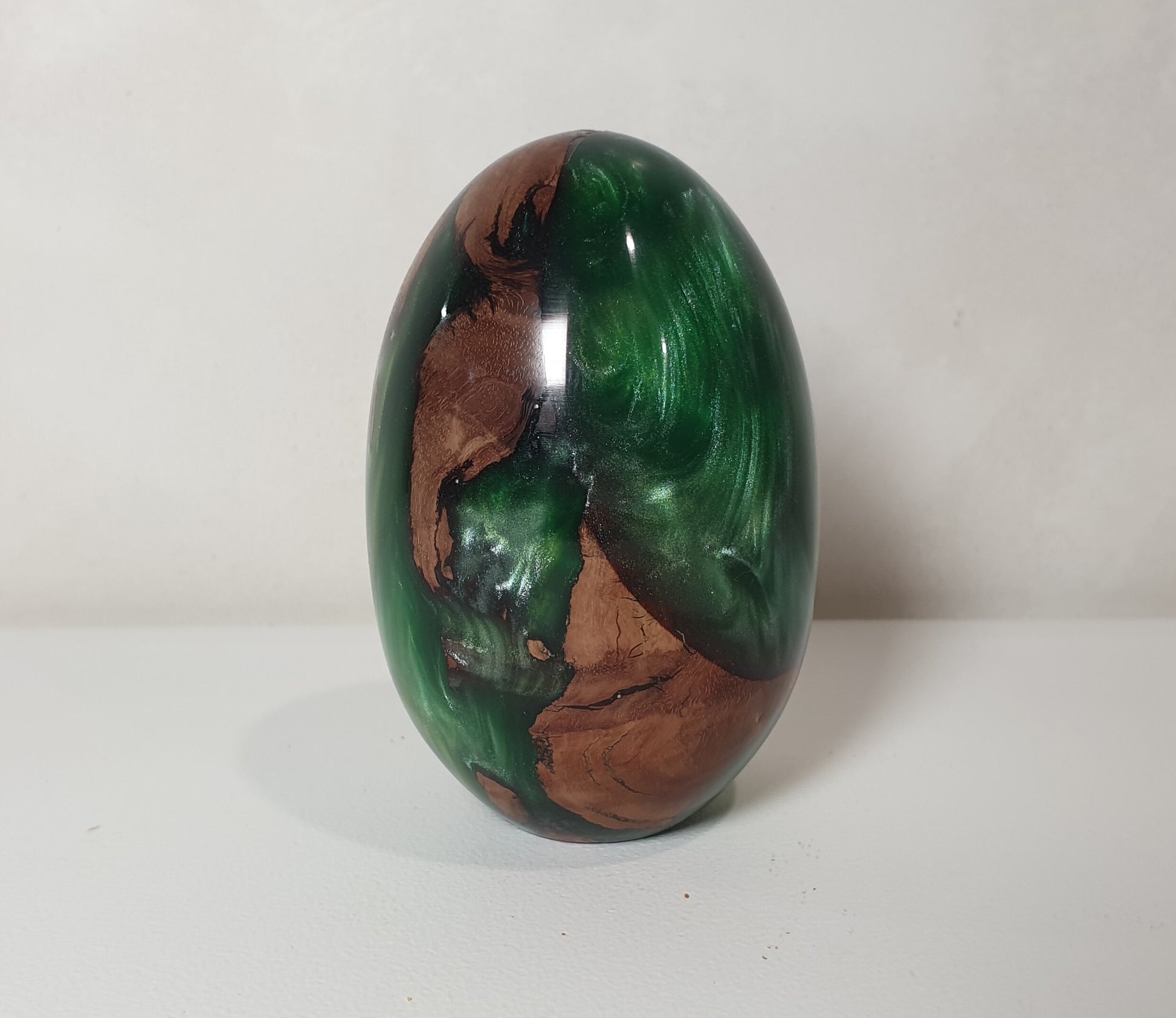 Handcrafted from iron wood and cast with emerald green pearlescent resin and shaped into an egg.