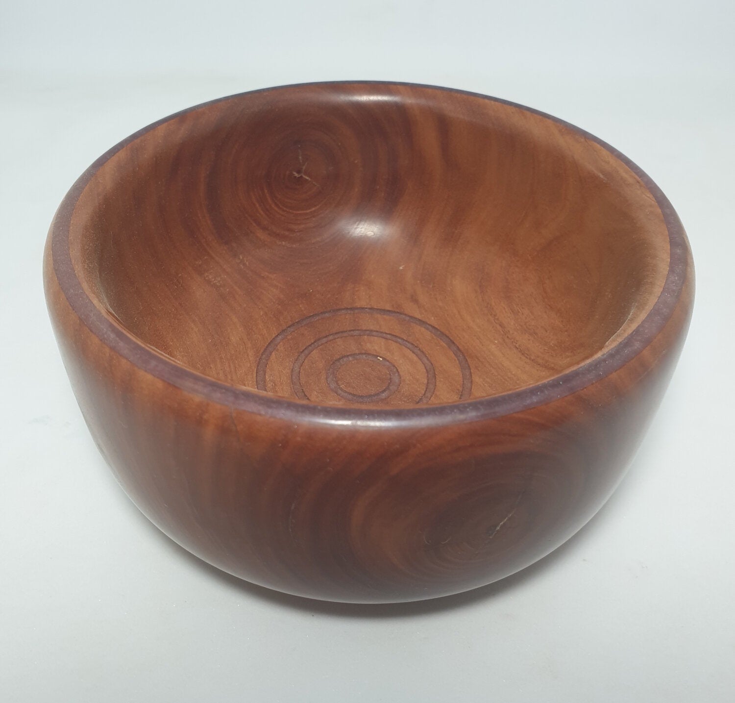 Handcrafted iron wood decorative bowl with translucent purple resin on rim and at base of the bowl.