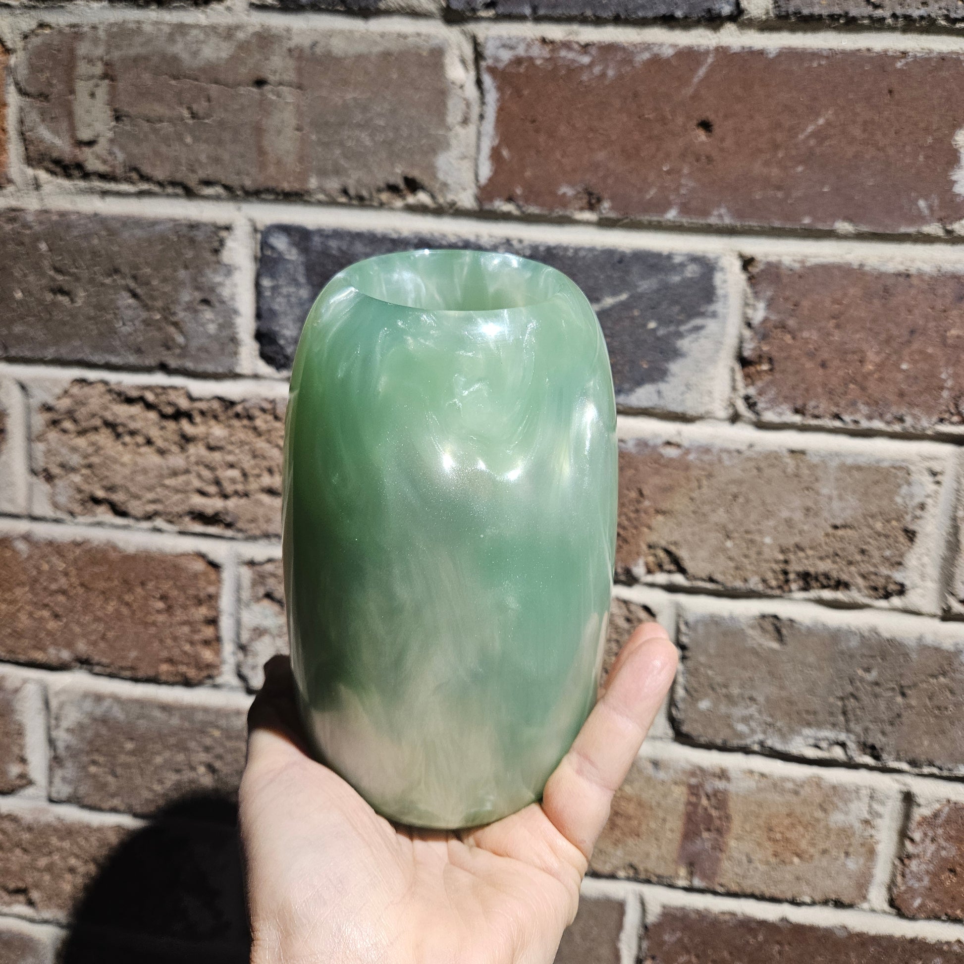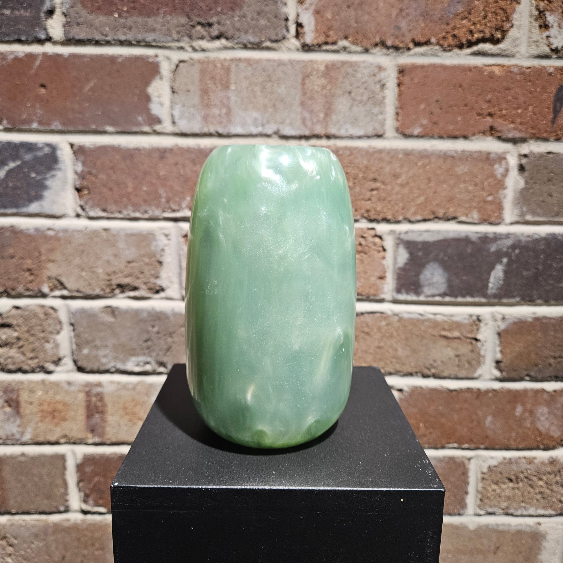 Handcrafted from metallic Jade coloured and white pearlescent resin vase.