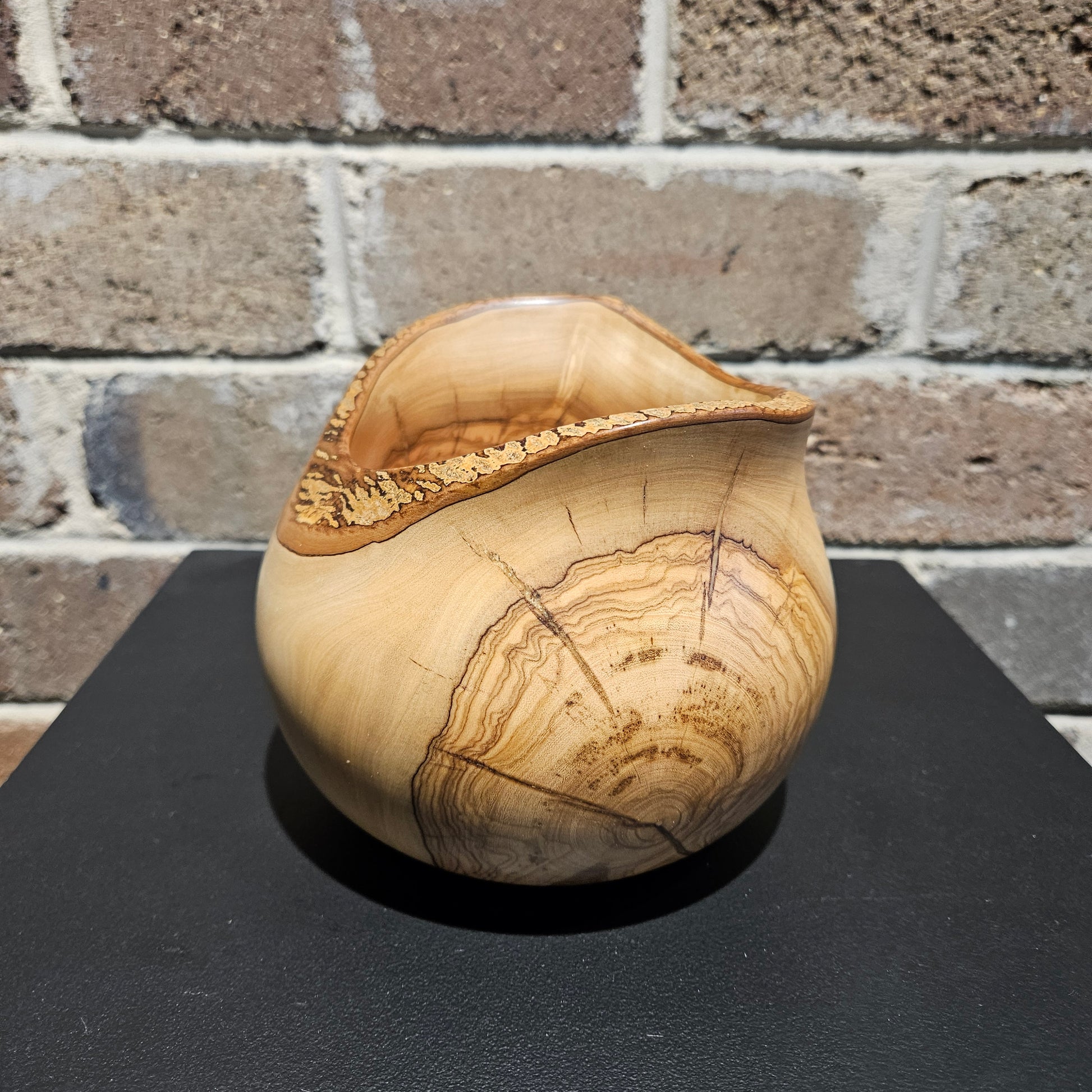 Handcrafted from Olive Wood and retaining its natural live edge rim. This unique piece was crafted from reclaimed olive tree that resulted from a storm. It would look stunning in any home.