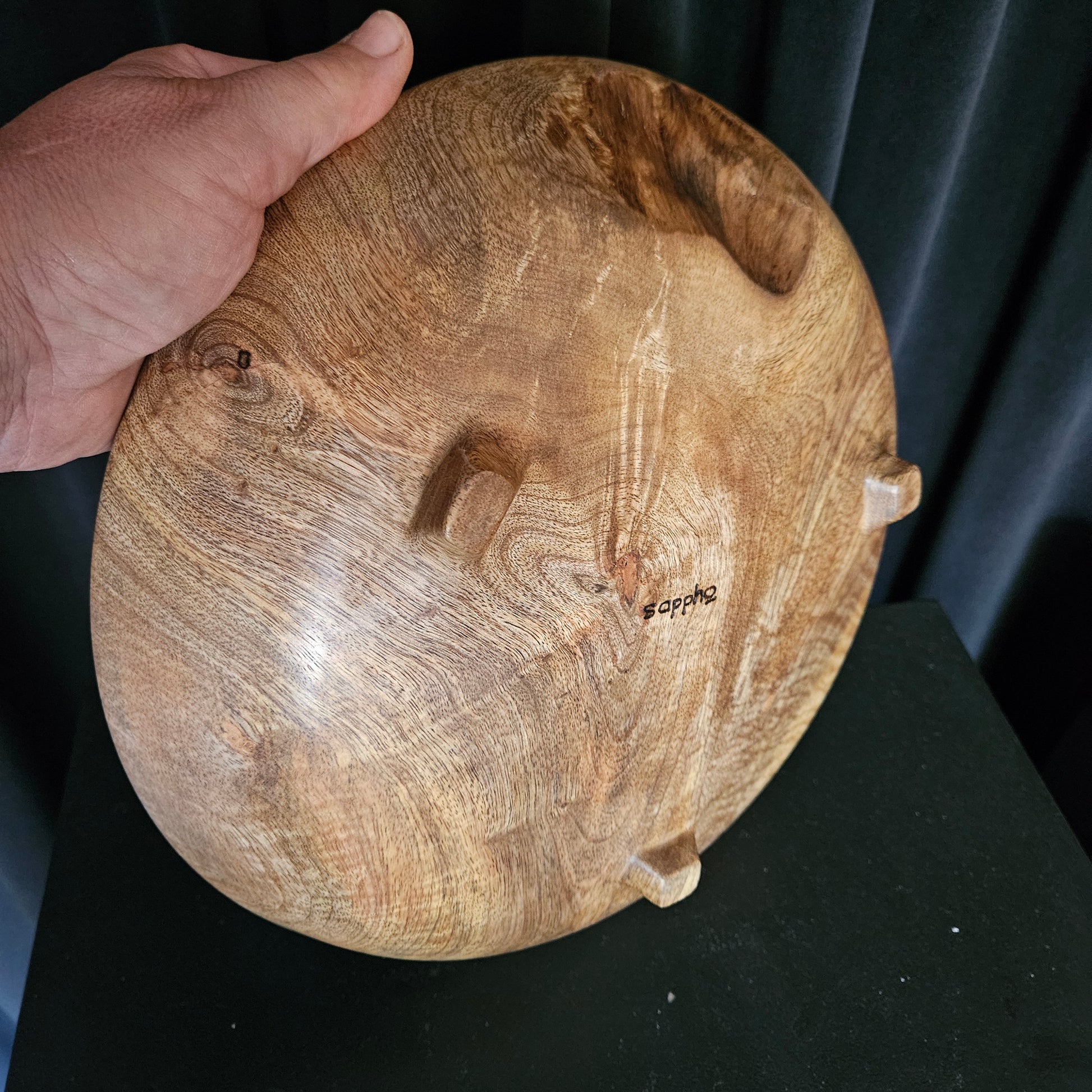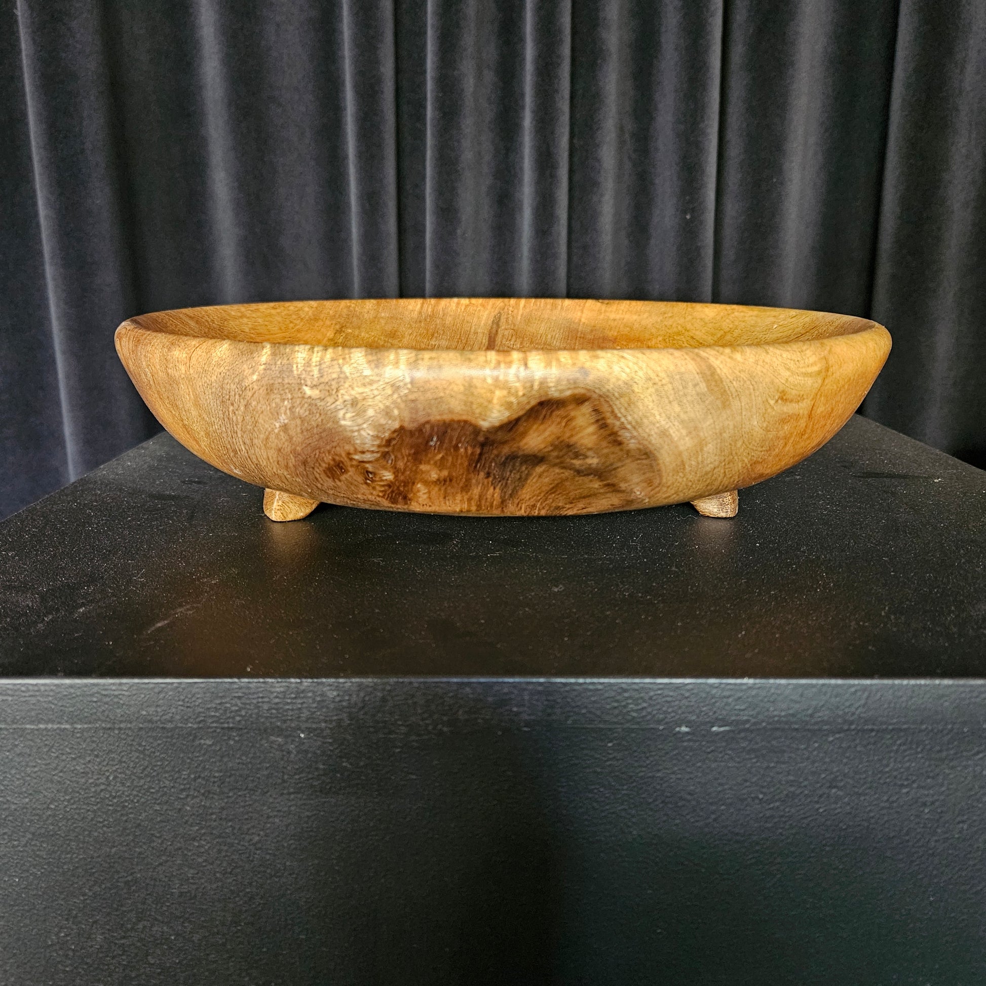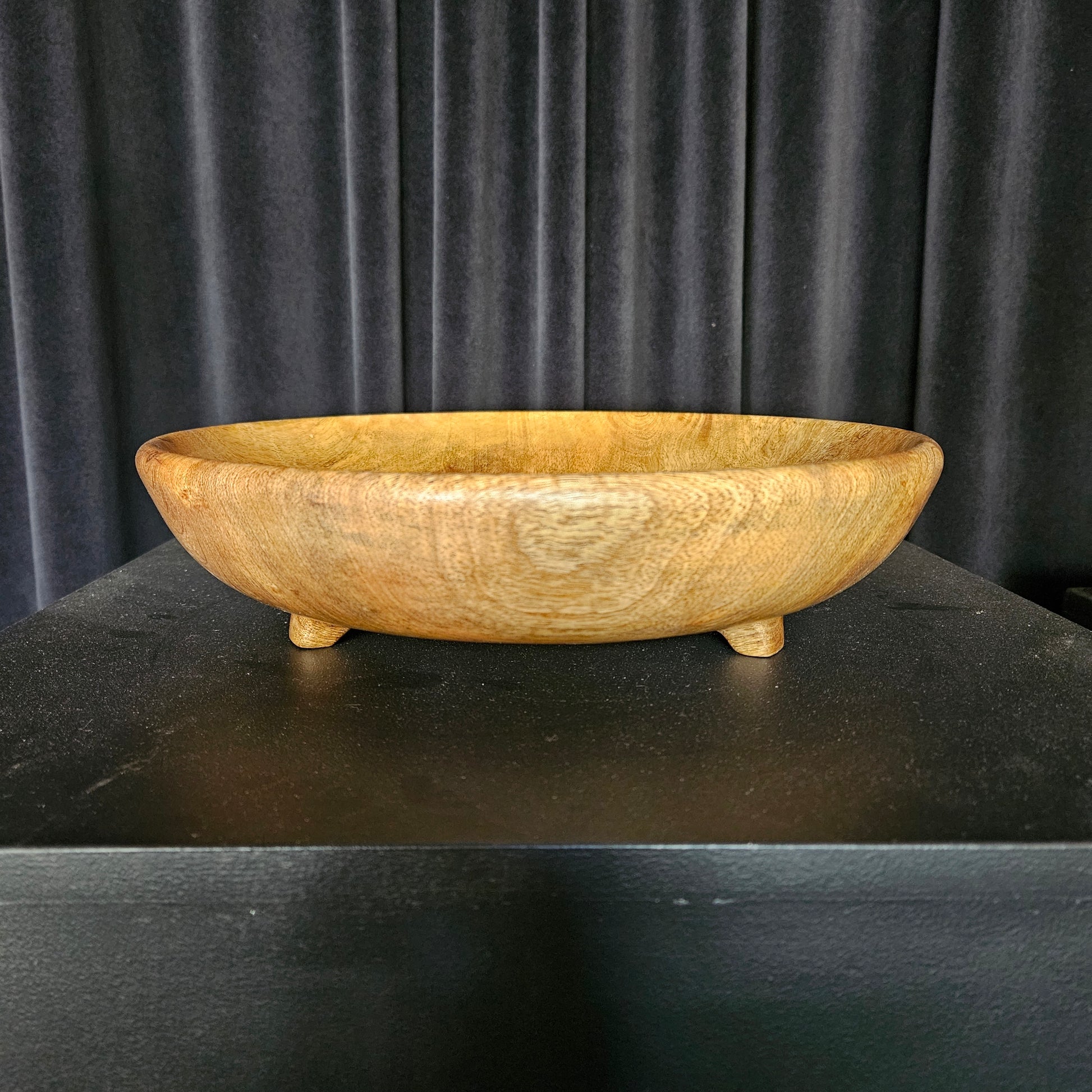 This unique one of a kind bowl is made from mango wood. It has 3 little carved feet that elevates it to give an elegance to the piece.