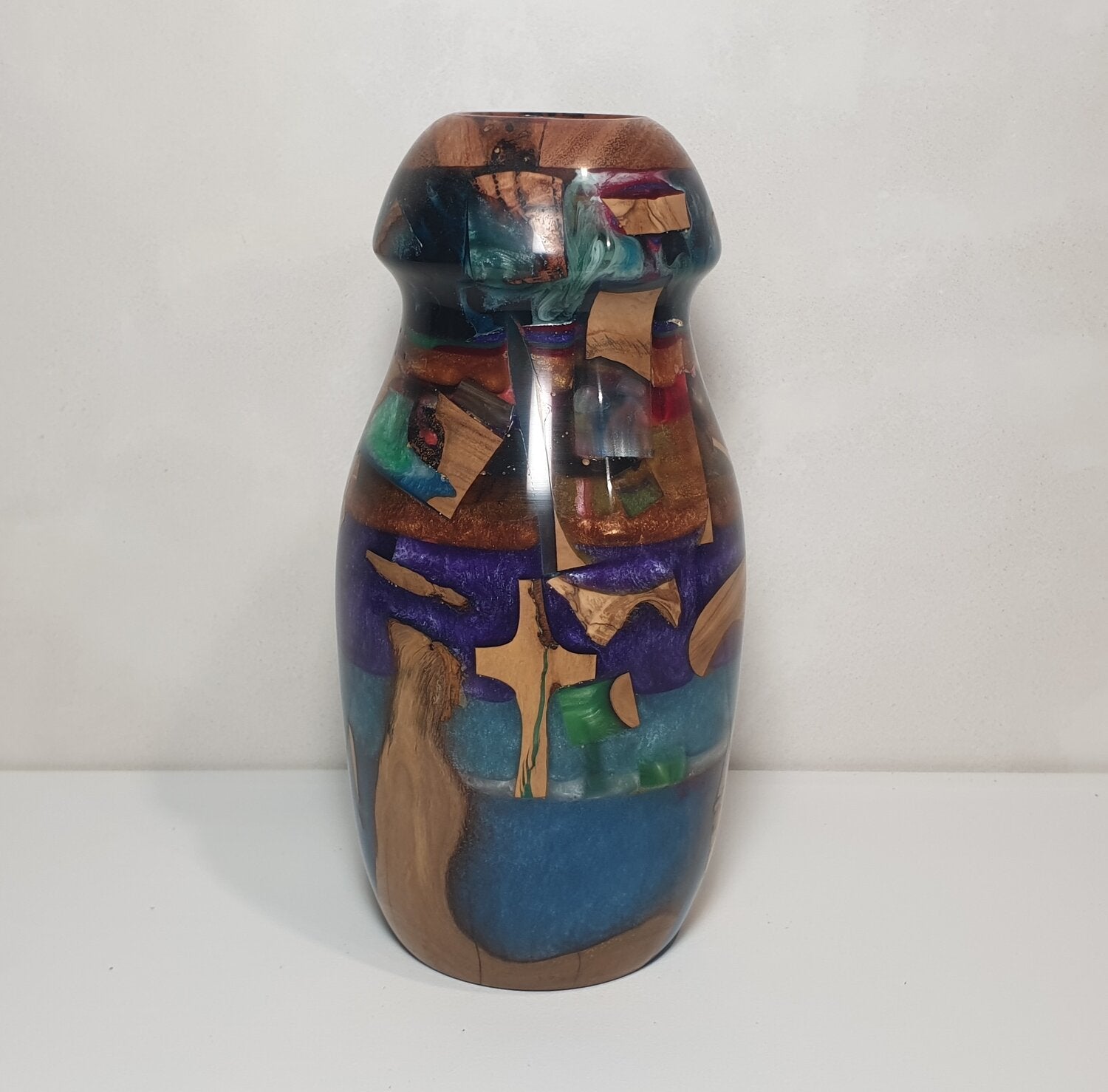 Handcrafted multi-coloured resin bud vase with eucalyptus and olive woods. Note the olive wood cross in the centre.