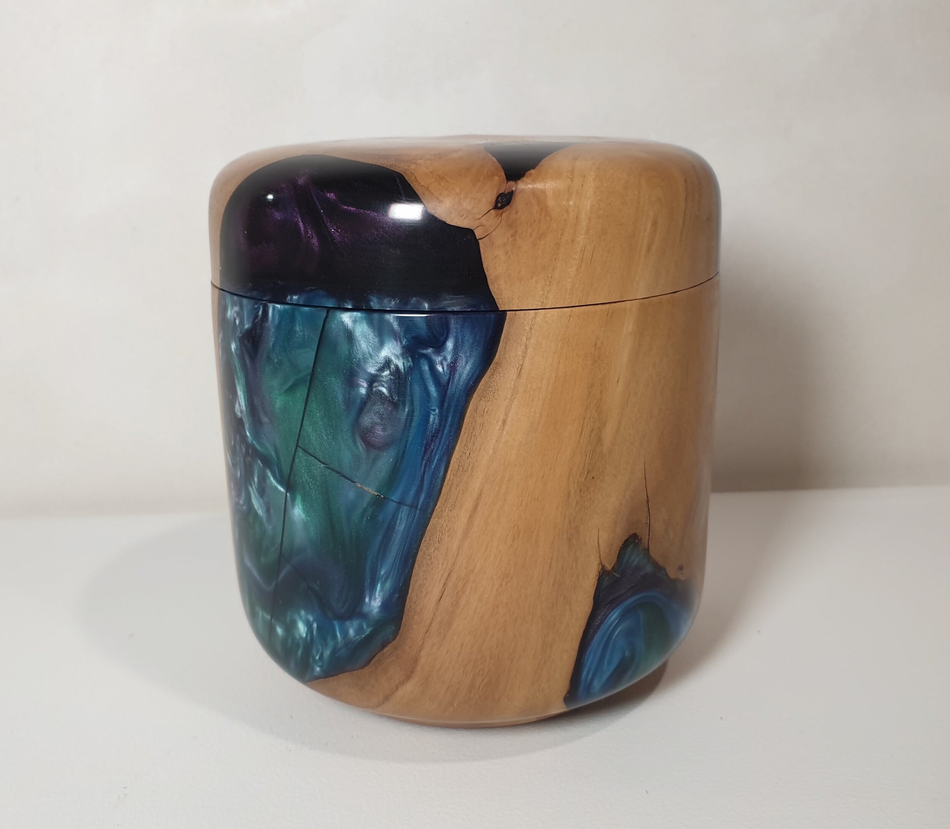 Handcrafted Olive wood canister with multi-coloured blue/purple resin in natural voids.