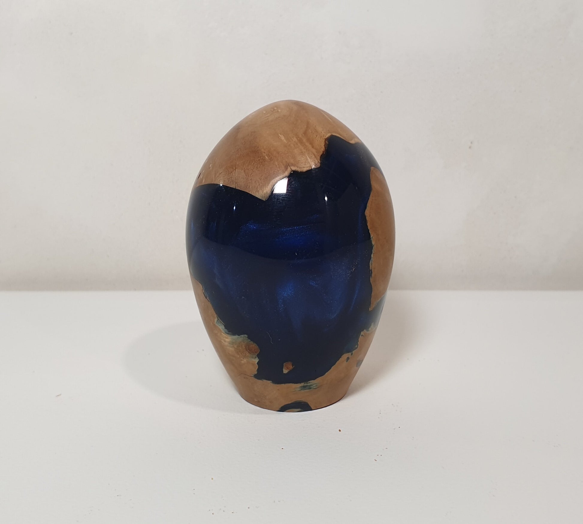 Handcrafted from olive wood and cast with dark blue resin and shaped into an egg.