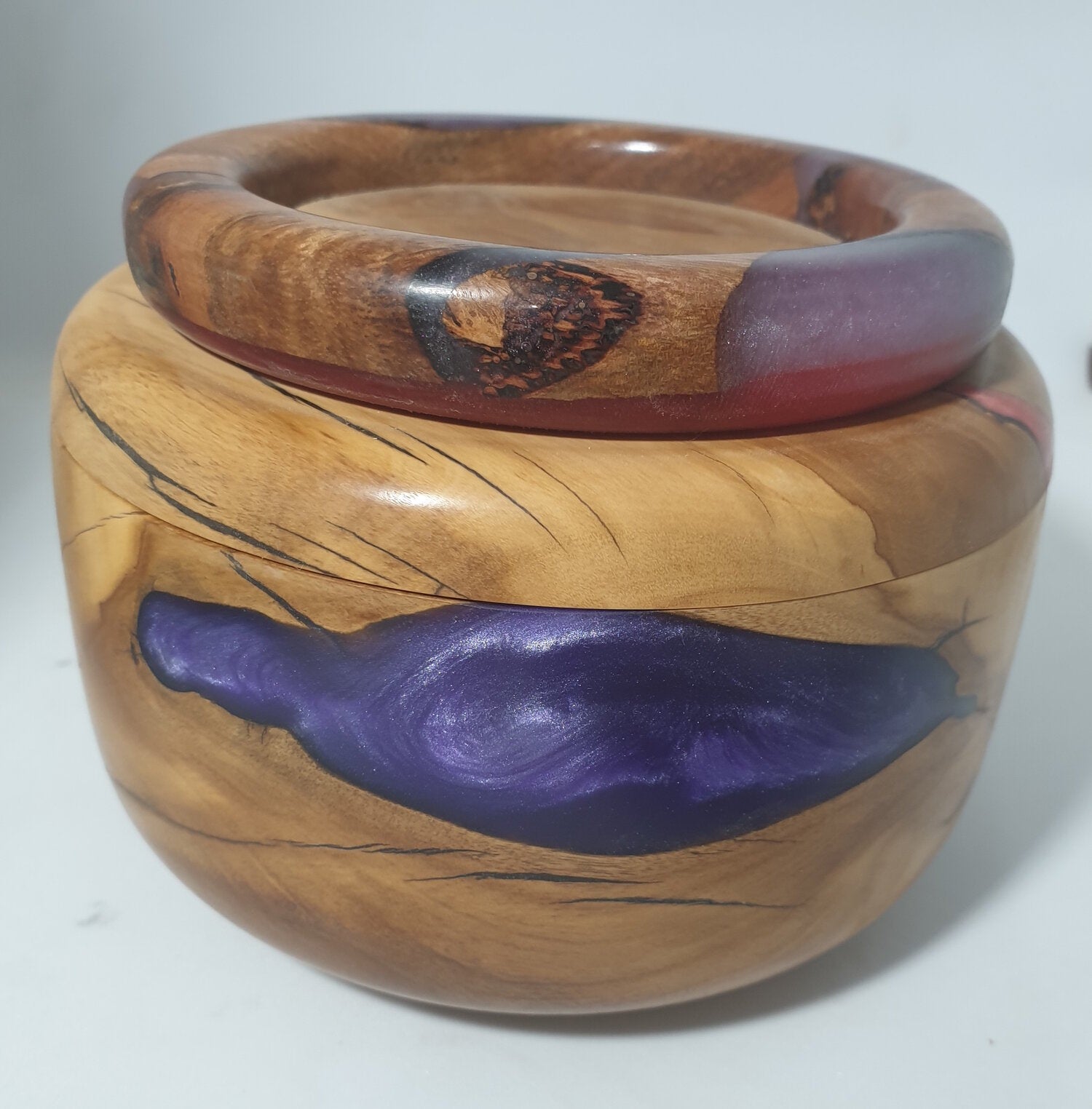 Handcrafted olive wood lidded box. The base has purple resin cast in the natural voids of the wood. The olive wood lid has an additional piece of eucalyptus wood with pinky/red resin in there natural voids shaped in a bracelet style rim design.