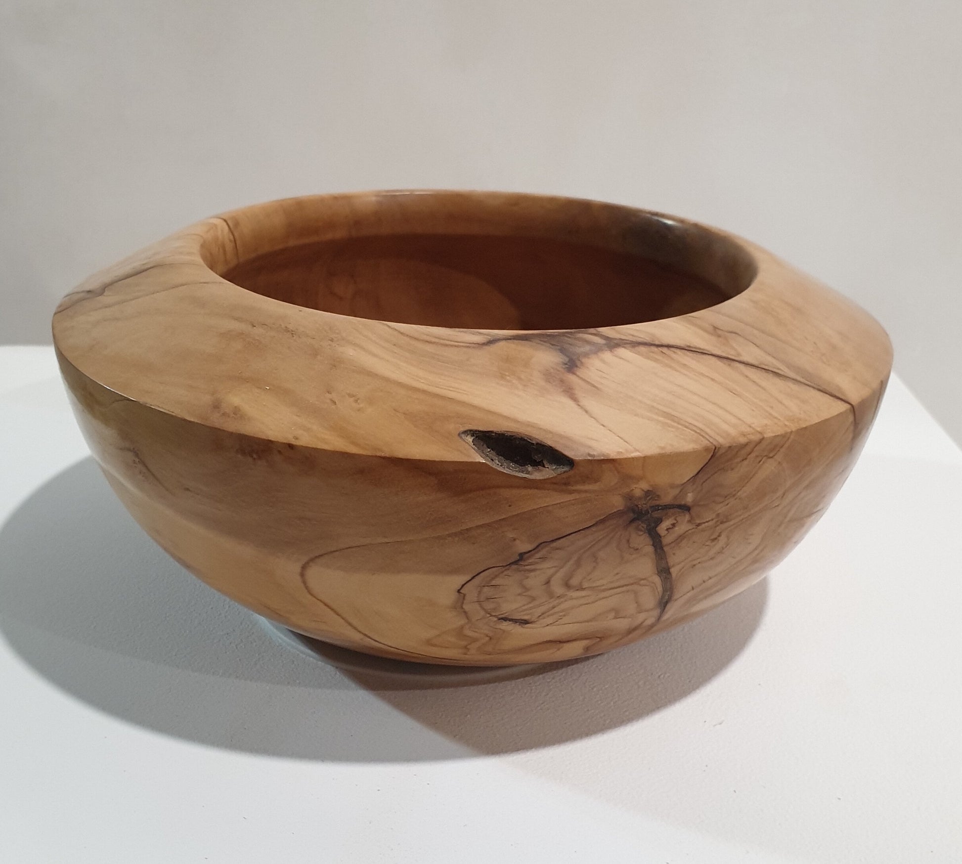 Handcrafted olive wood bowl with wide rim design and natural inclusions.