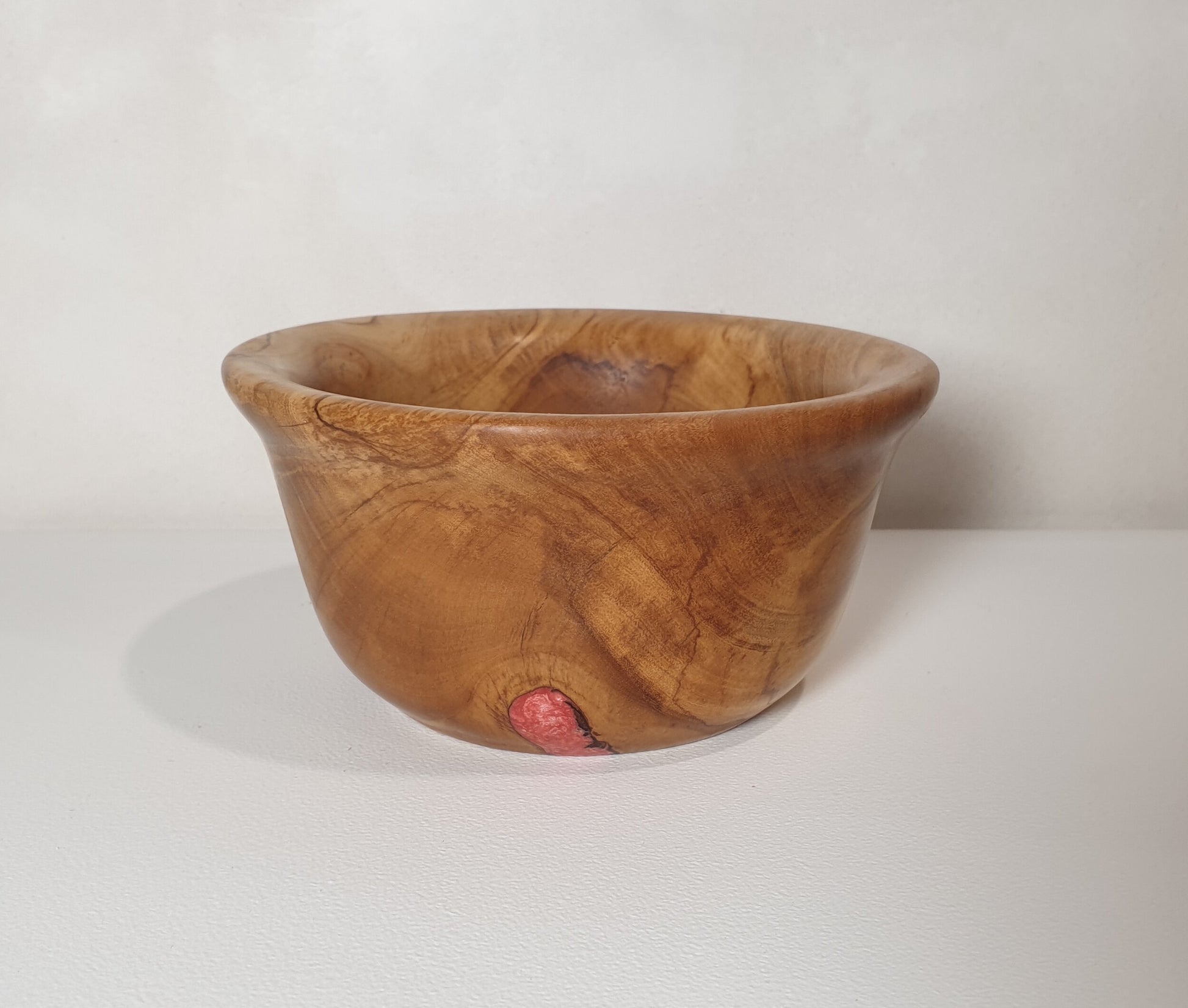 Handcrafted olive wood bowl with small pink resin inclusion in void.