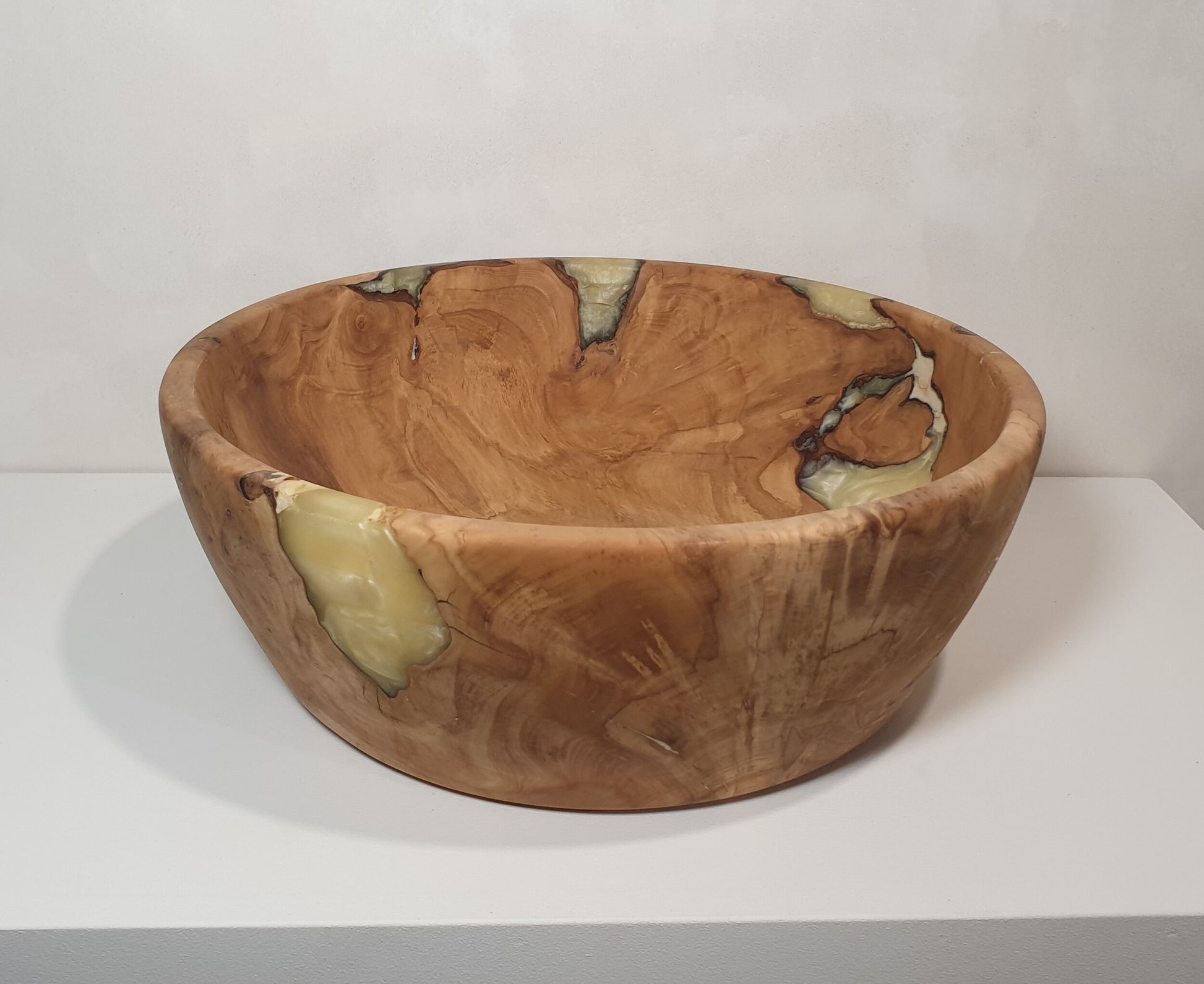 Handcrafted olive wood bowl with pearl white resin inclusions in natural voids.