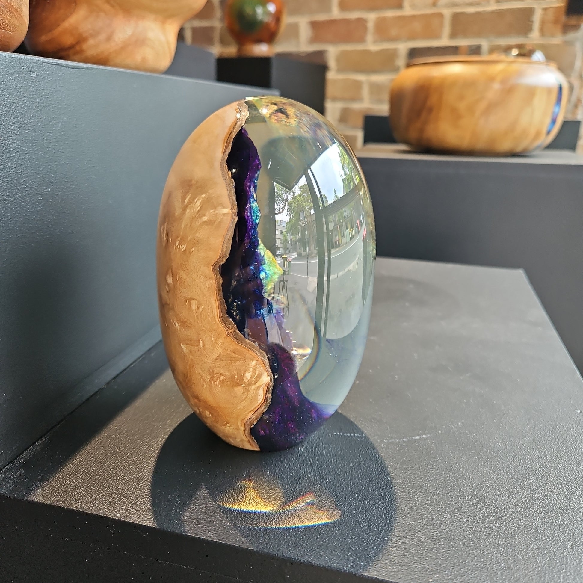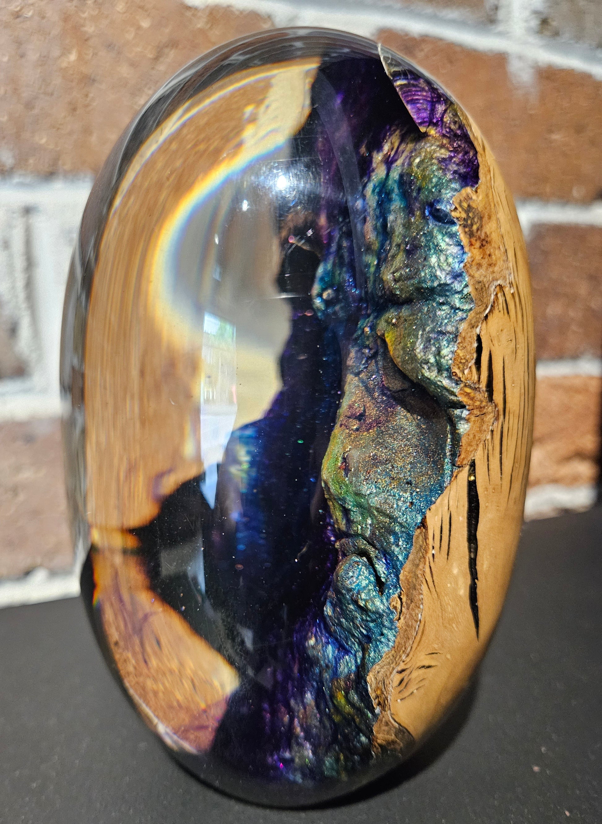 This unique hand made piece is olive burl wood with metallic emerald, Teal, gold and purple pigments. The colours are mesmerising under lights.