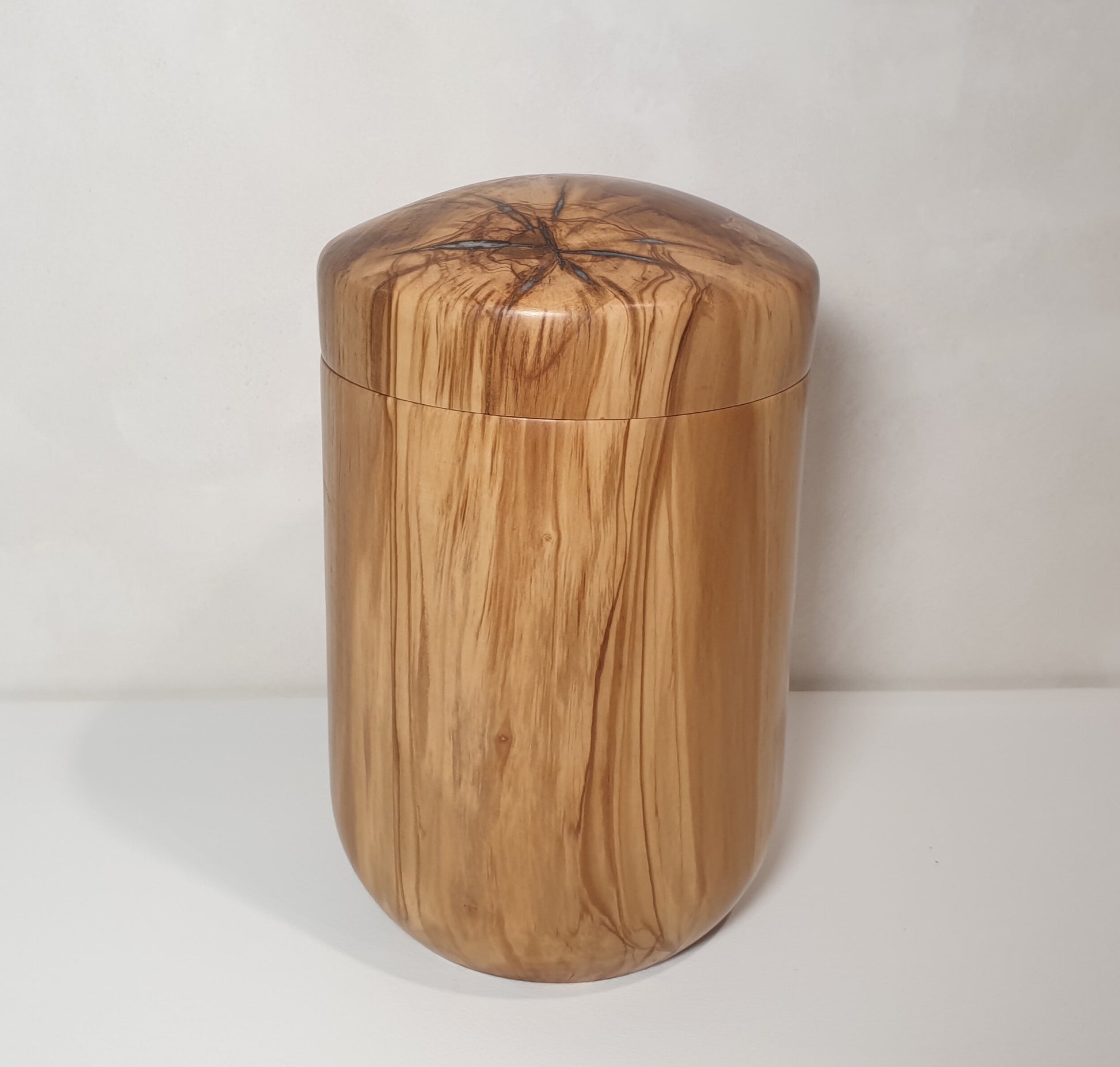 Handcrafted from olive wood. The lid has white resin in the natural void.