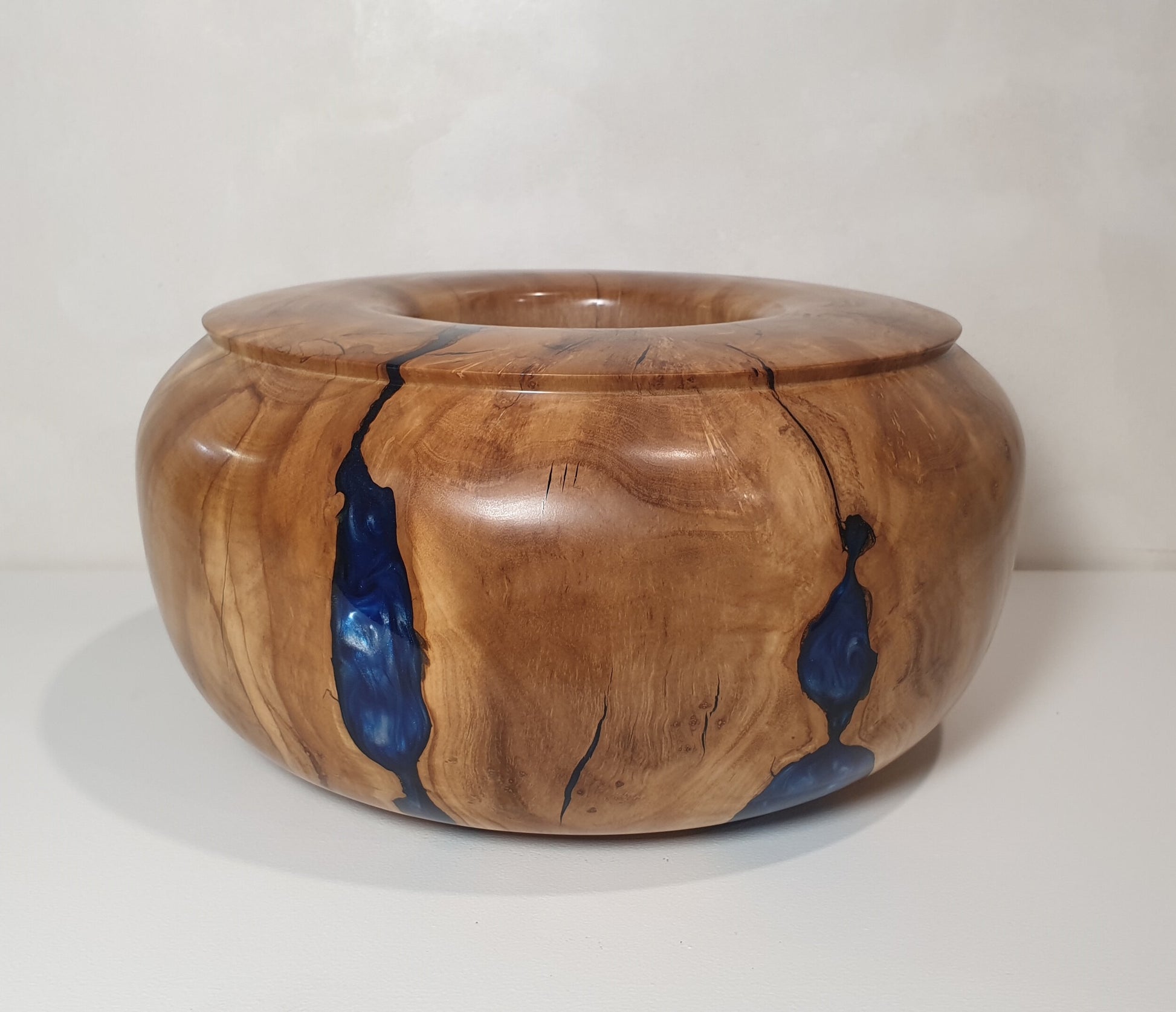 Handcrafted from solid olive wood burl. The natural voids of this root ball have been cast with deep blue resin inclusions. It has a wide decorative rim.
