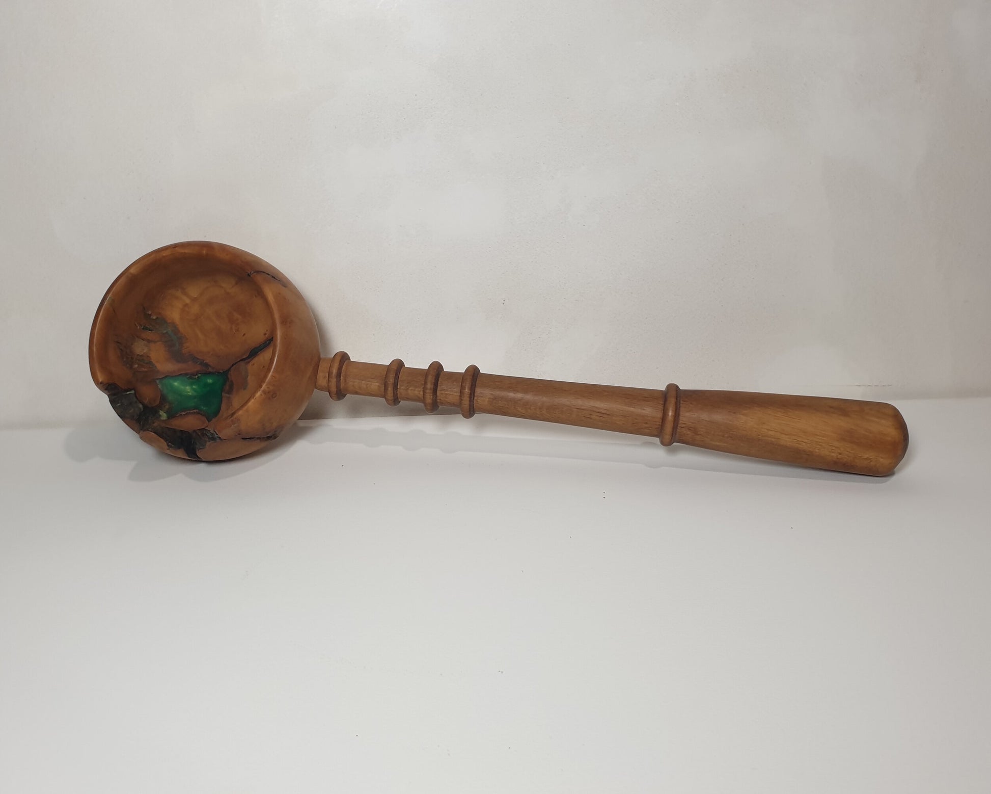 Handcrafted from olive wood. The ladle cup has a green resin in the natural void. Its finished with my own made beeswax and olive oil from my olive trees in Greece. This is a decorative piece.